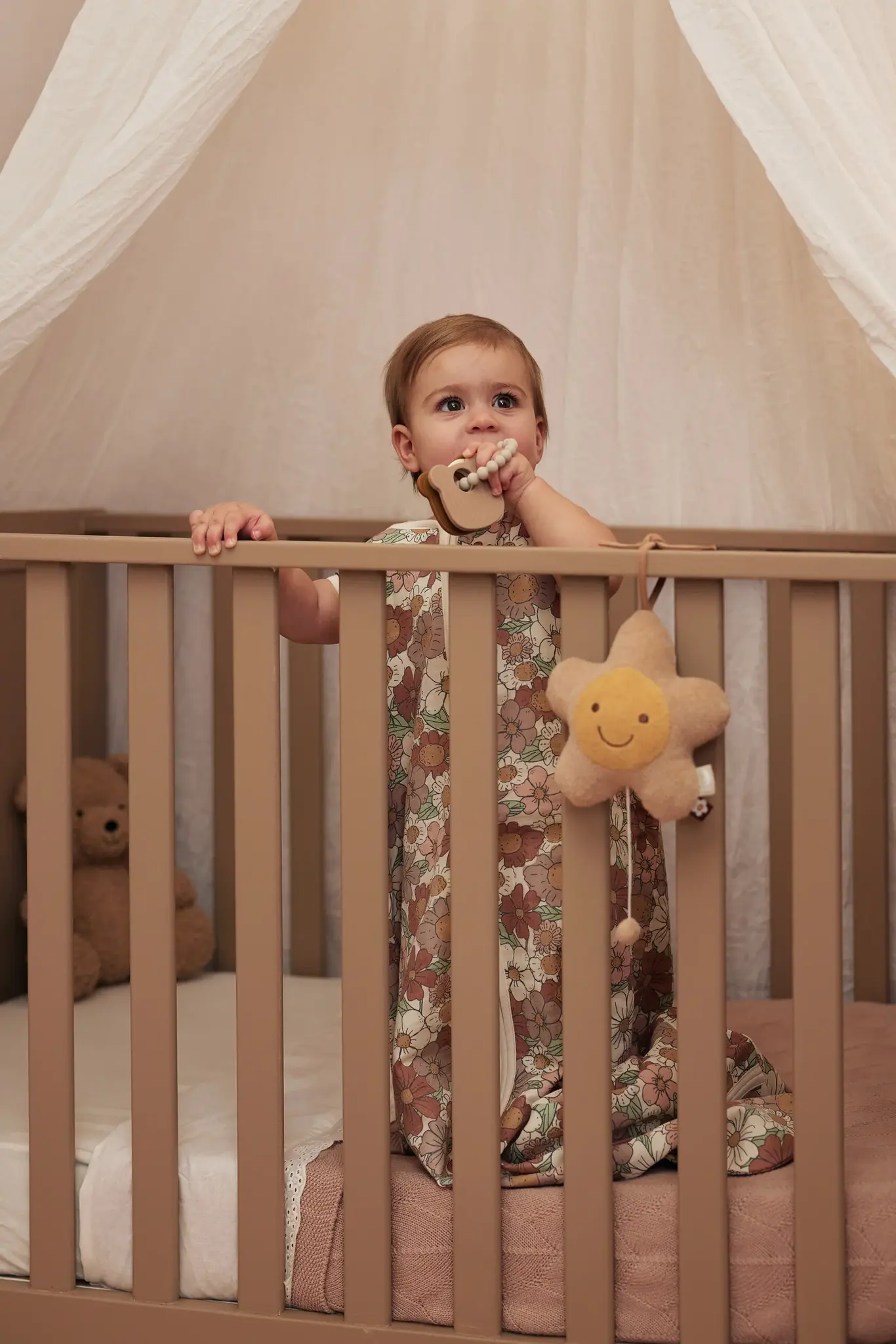 Deze siliconen bijtring met neutrale kleuren is een perfect speeltje voor kleintjes die graag dingen in hun mond doen. Ook erg geschikt voor kindjes die last hebben van beginnende tandjes. Het is dan erg fijn voor je kleintje om ergens op te kunnen bijten. De bolletjes ring werkt verlichtend voor beginnende tandjes. De siliconen sleutelbos bevat twee lieve teddy bear hoofdjes, waarvan een berenhoofdje een lief 3D gezichtjes heeft. Het andere beertje heeft strepen en de sleutel bevat bolletjes. Ideaal voor thuis of onderweg! Met de siliconenringen maak je de deze leuke bijtring gemakkelijk vast aan de kinderwagen of autostoel.