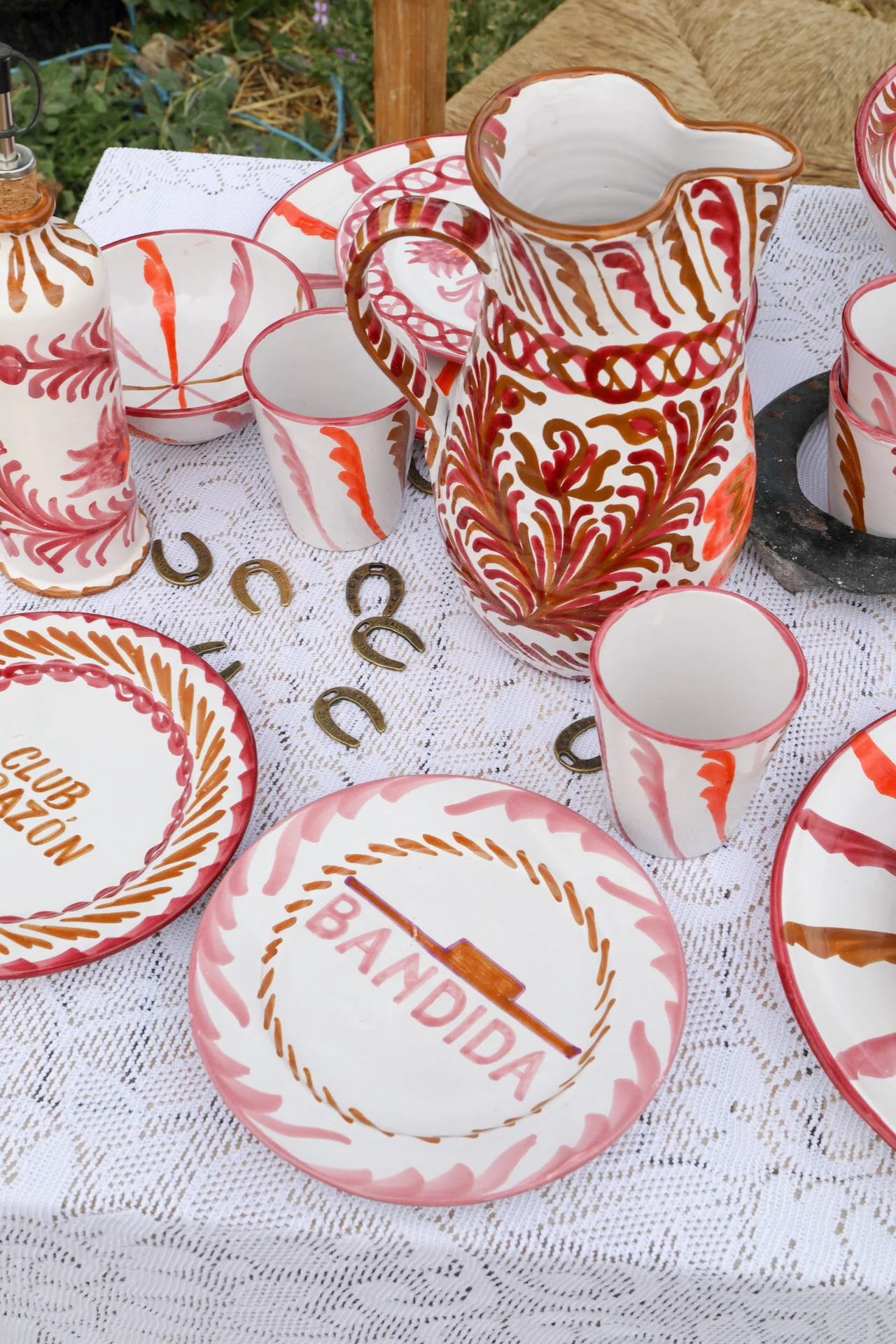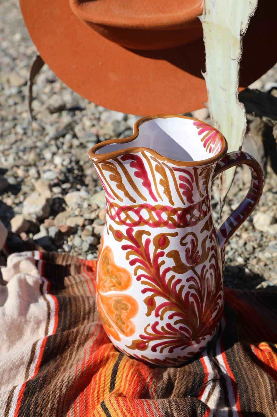 Elk stuk is met de hand vervaardigd en beschilderd in Spanje. De rijke kleuren bordeaux, roze, oranje en caramel brengen warmte en levendigheid in elk interieur.